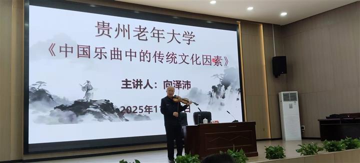 11月27日,贵州老年大学内座无虚席,一场由贵州老年大学与贵州师范大学联合主办的专题讲座《中国乐曲中的传统文化因素》在此举行。年届八旬、艺术生涯已逾70载的著名小提琴家、国家一级演奏员向泽沛先生精神矍铄地站在讲台前,仿佛一棵不老松,声音洪亮如钟,一开口就抓住了全场100多颗心。