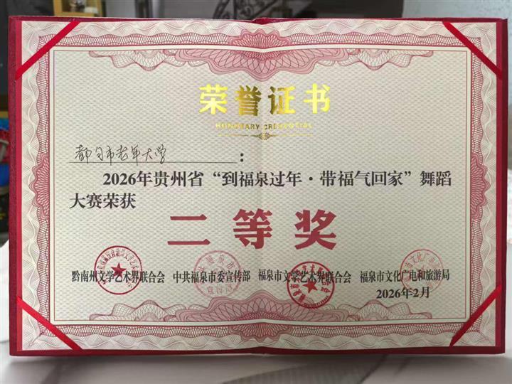 福暖新春,舞韵飞扬。丙午马年正月初七、初八,由贵州省舞蹈家协会、黔南州委宣传部指导,黔南州文联、黔南州文旅局、福泉市委宣传部主办,黔南州舞协、福泉市文联、福泉市文旅局、贵州润立集团承办的2026年贵州省“到福泉过年·带福气回家”舞蹈大赛在福泉水街广场圆满落幕。都匀市老年大学舞蹈艺术团在赛场上大放异彩,荣获大赛二等奖。
