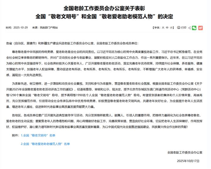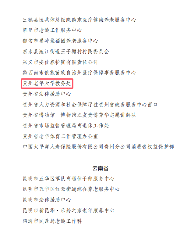 近日,全国老龄工作委员会办公室公布2025年全国敬老爱老助老活动评选结果,贵州老年大学教务处荣获全国“敬老文明号”称号。