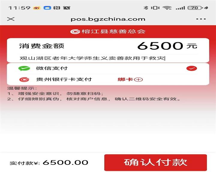 此次义卖活动共分7个小组,由师生志愿者选出代表作为各组组长,负责各小组的义卖收款和登记,两天活动结束后仍有爱心朋友参与义买,奉献爱心。截止2025年6月30日,观山湖区老年大学师生、家属共为榕江救灾募集资金6500元,并向榕江县慈善总会进行了捐赠,希望自己微薄的力量能够为受灾的榕江人民带去一些温暖。