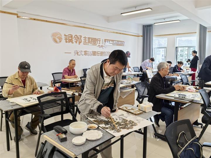在兴义市农商银行倾力打造的书画教室内,学员们现场创作,笔墨传情,围绕“银邻共融”“金融惠民”“传统文化”等主题,现场创作了30余幅书画作品。行草隶篆各展风骨,山水花鸟栩栩如生,展现了老年学员扎实的艺术功底和积极向上的精神风貌。活动中,老年学员与银行员工围坐交流,分享创作心得与艺术感悟。农商银行员工纷纷表示,近距离感受书画艺术的魅力,既缓解了工作压力,也加深了对传统文化的理解。