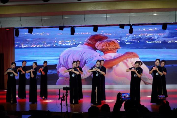 在文艺汇演环节,市老年大学长征艺术团带来的具有浓郁民族风格的《羊角花开》《吉且鼓》,以欢快悠扬、激扬豪放的合唱点燃现场氛围,紧接着,古典舞《采菊东篱》以肢体为笔、以舞姿为墨,把重阳的菊香与东篱的悠然编织成一幅灵动的画卷。旗袍秀《搀扶》以优雅的舞步诉说着岁月的厚重,感恩生命中的相互帮助,让整场演出温情满满。当《草原牧歌》的旋律缓缓响起,老年学员们迈着欢快的舞步翩翩起舞,仿佛带领观众走进了那片令人心驰神往的草原。中国风时装秀《绿水青山》将自然与国风完美结合,引领观众跟随青绿色的衣袂流转,尽情感受“老年节”独有的浪漫,并将整场演出推向了高潮。随后,电吹管合奏《山丹丹花开红艳艳》、 舞蹈《翻身农奴把歌唱》、诗朗诵《九九重阳》、二胡演奏《八月桂花遍地开》《赛马》、舞蹈《梅韵兰姿》等精彩节目依次上演,现场气氛热烈,掌声此起彼伏。最后,整场演出在合唱《夕阳红》《今天是你的生日》中落下帷幕,让大家在熟悉的旋律中再次感受重阳节的温暖与对祖国的热爱。