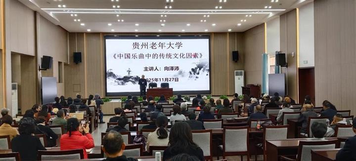11月27日,贵州老年大学内座无虚席,一场由贵州老年大学与贵州师范大学联合主办的专题讲座《中国乐曲中的传统文化因素》在此举行。年届八旬、艺术生涯已逾70载的著名小提琴家、国家一级演奏员向泽沛先生精神矍铄地站在讲台前,仿佛一棵不老松,声音洪亮如钟,一开口就抓住了全场100多颗心。