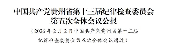 中国共产党贵州省第十三届纪律检查委员会第五次全体会议,于2026年2月1日至2日在贵阳举行。出席这次全会的有省纪委委员33人,列席133人。