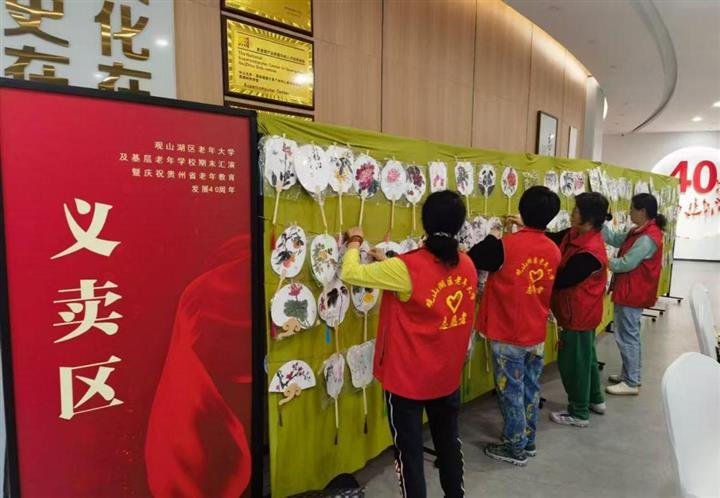 在观山湖区老年大学及基层老年学校期末汇演暨庆祝贵州省老年教育发展40周年活动现场,一边是老年学员们声情并茂的倾情展示,一边是观山湖区老年大学师生志愿者搭起的义卖展台,志愿者们忙碌张罗着展品,将师生志愿者们亲自绘制的国画、书法作品,手工制作的烘焙食品、艾草捶、簪花、零钱包等逐一陈列。围观群众络绎不绝,大家纷纷义买自己心仪的作品,观山湖区老年大学的师生及家属也积极参与义买,奉献自己的爱心。