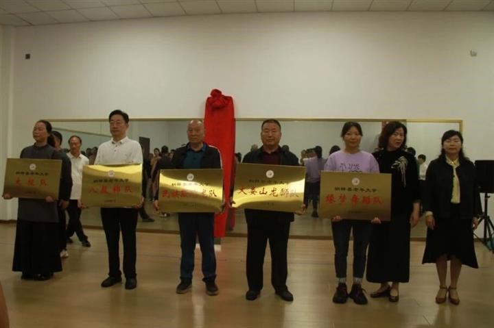 在揭牌环节,钟昭容、江俞共同为县老年大学南校区揭牌。随着红绸缓缓落下,“桐梓县老年大学南校区” 的牌匾展露,现场响起热烈的掌声,标志着桐梓县老年大学南校区正式成立办学。随后6支校外班队负责人依次上台,在掌声中接过班队牌。
