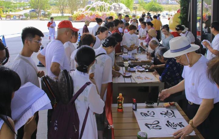 在书画创作区,师生们挥毫泼墨,或写苍劲有力的书法,或绘栩栩如生的山水花鸟,一幅幅精美的书画作品在他们的笔下诞生。活动现场气氛热烈非凡,期间还出现了温馨动人的互动场景,有游客现场“点单”,提出自己心仪的书画主题与风格,师生们欣然应允,不多时,一幅幅作品便跃然纸上,游客们接过作品,眼中满是惊喜与感动,有的游客小心翼翼地捧着作品,仿佛捧着一件稀世珍宝;有的游客则迫不及待地与书画创作者合影留念,记录下这难忘的瞬间。