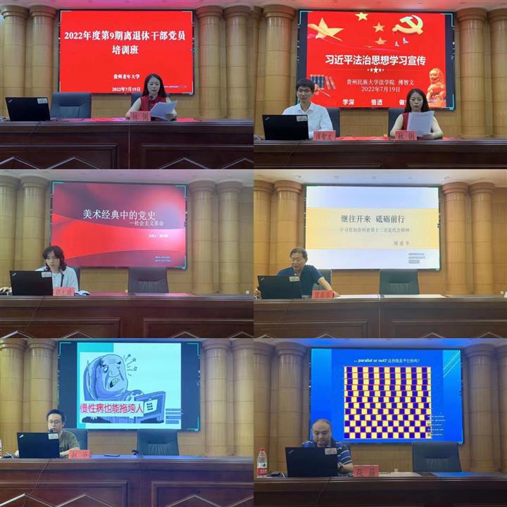 本次培训为期3天,共24学时。特邀省委党校原教育长周感华、贵州民族大学法学院教授傅智文、贵阳市电化教育馆业务室负责人张籍、贵阳市第四人民医院老年病科主任医师赵予、贵州老年大学教师邵尤晴和贵州老年大学四级调研员林俐分别讲授《省第十三次党代会精神解读》、《习近平法治思想分享》、《跨代沟沟通——情绪的秘密》、《常见老年慢性病的预防》、《美术经典中的党史——社会主义革命史》和 《手机智能技术运用》等课程。